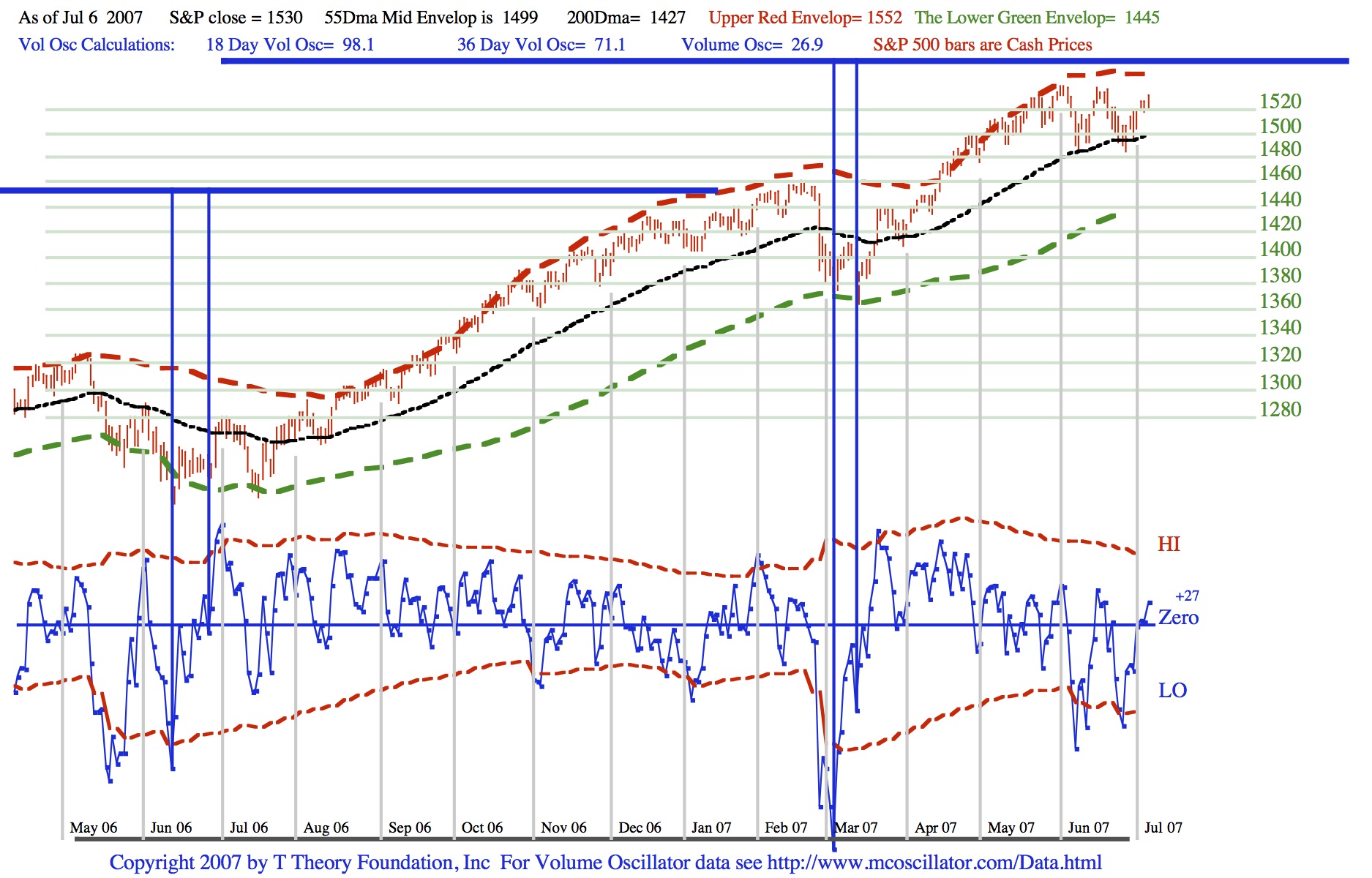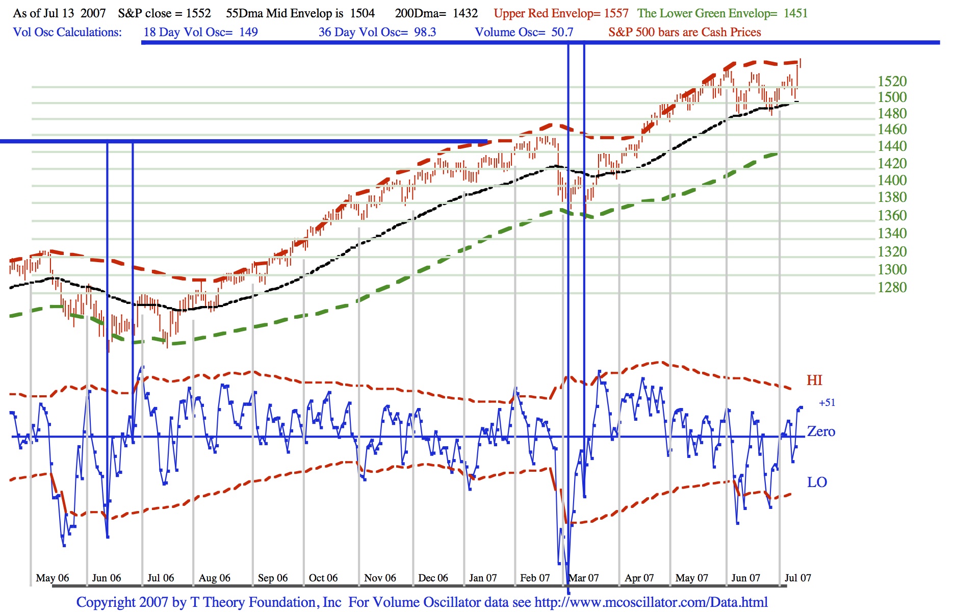 Use the link below to view the PDF image of the current blue volume oscillator and the S&P bars as the relate to my key three envelope reversal lines; the upper red dashed line currently at S&P 1561,the black dotted 55 day MA at 1509 and the lower green dashed line at 1456. A bottom should be forming this week.