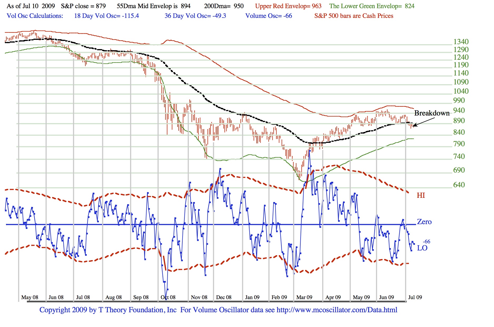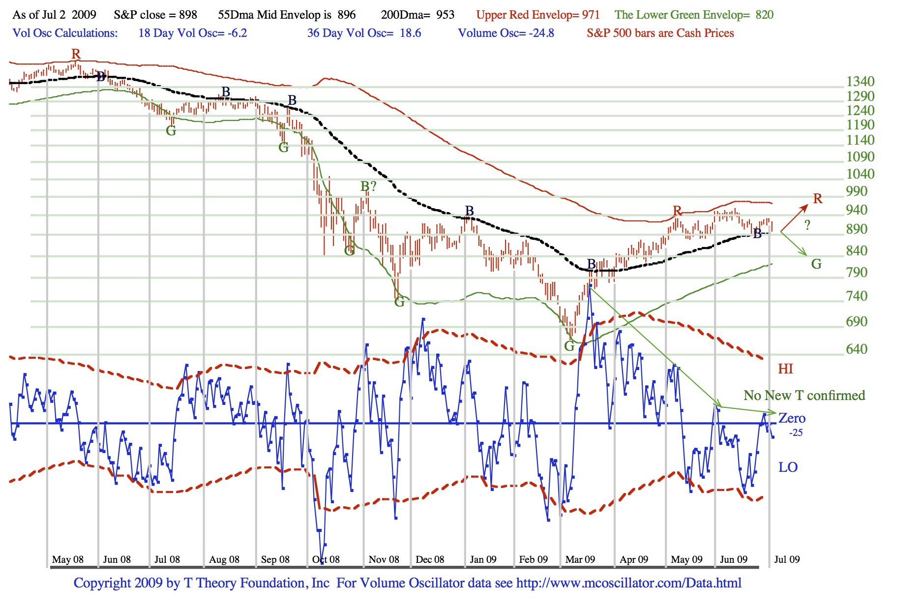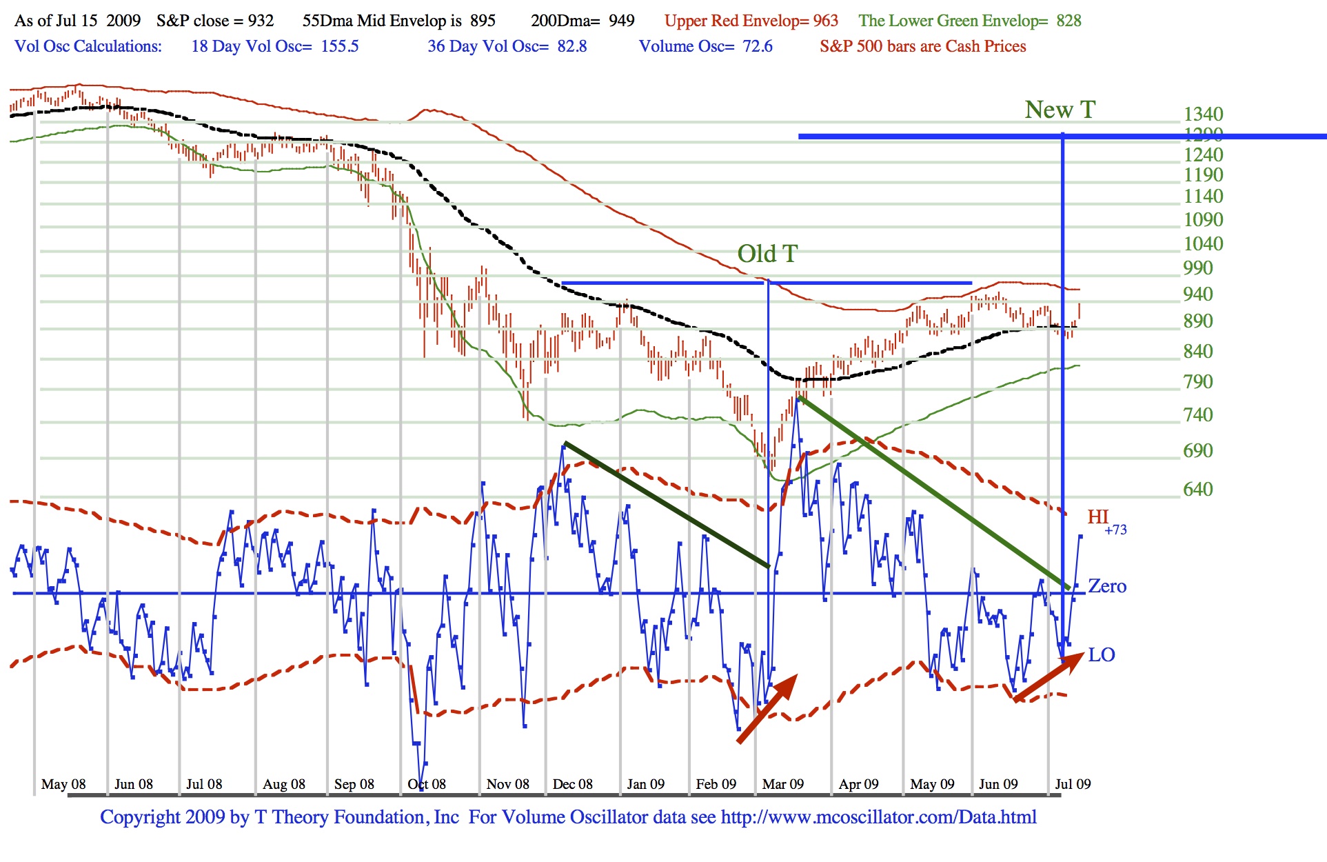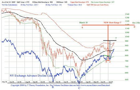 Calculation of the small new Short Range T; Data (a= March 18 2009; b=Jun 23 2009 c= July 10 2009) so the next projected short term peak is near Oct 15 2009.