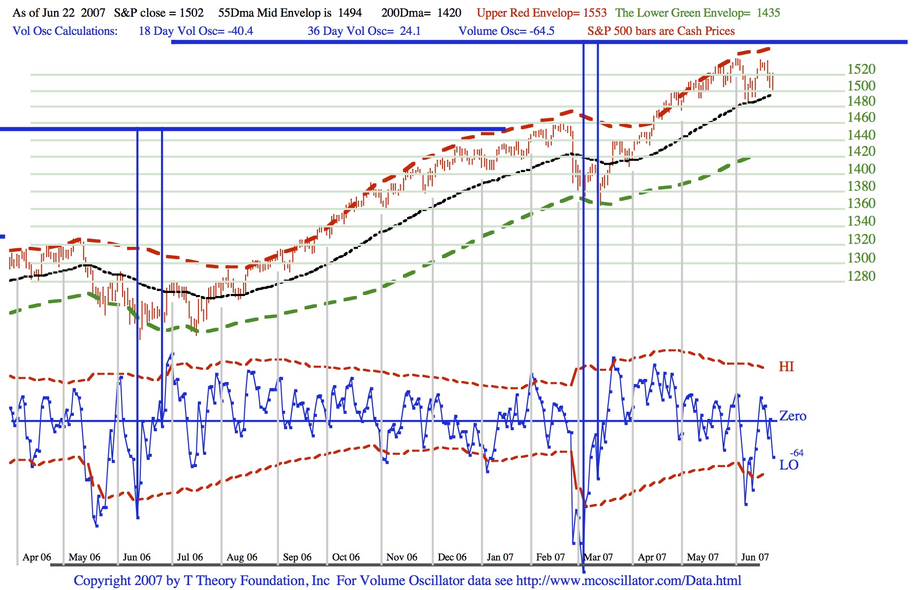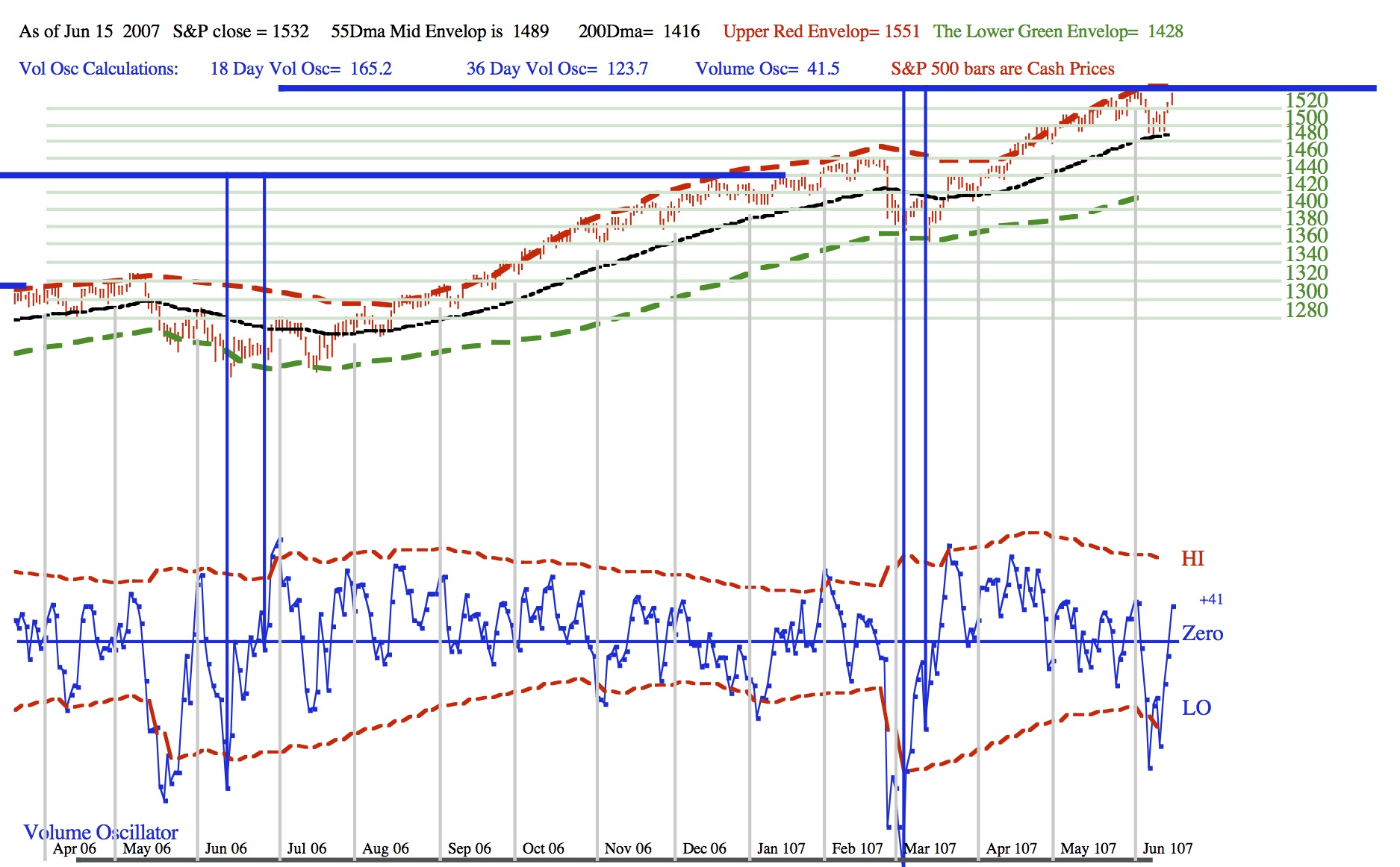 Note the rising bottoms in the lower plot as the Volume oscillator made a nice rising bottom on the second selloff last week. This is the most common way that daily calculation of the volume oscillator can be used to find buying opportunities. It usually signals a turning of the market’s momentum in an ongoing bull market.