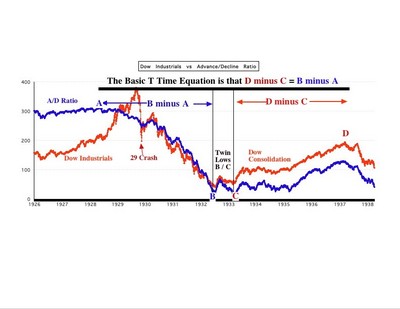 If you locate the mid point between B and C and call it the Ts center post date, as my chart suggests, then the cash Build Up phase that defines the left side of the T last the number of days from A to the midpoint of B and C. All Ts require that the general market averages or other prices advance in the right side of the T for an equal time, so it becomes possible to estimate the final peak date at the T’s right end. This date is only of technical interest now but the estimate needs to be made sooner or later. Alternatively use can use the time equation in the first chart. The results have to the same.