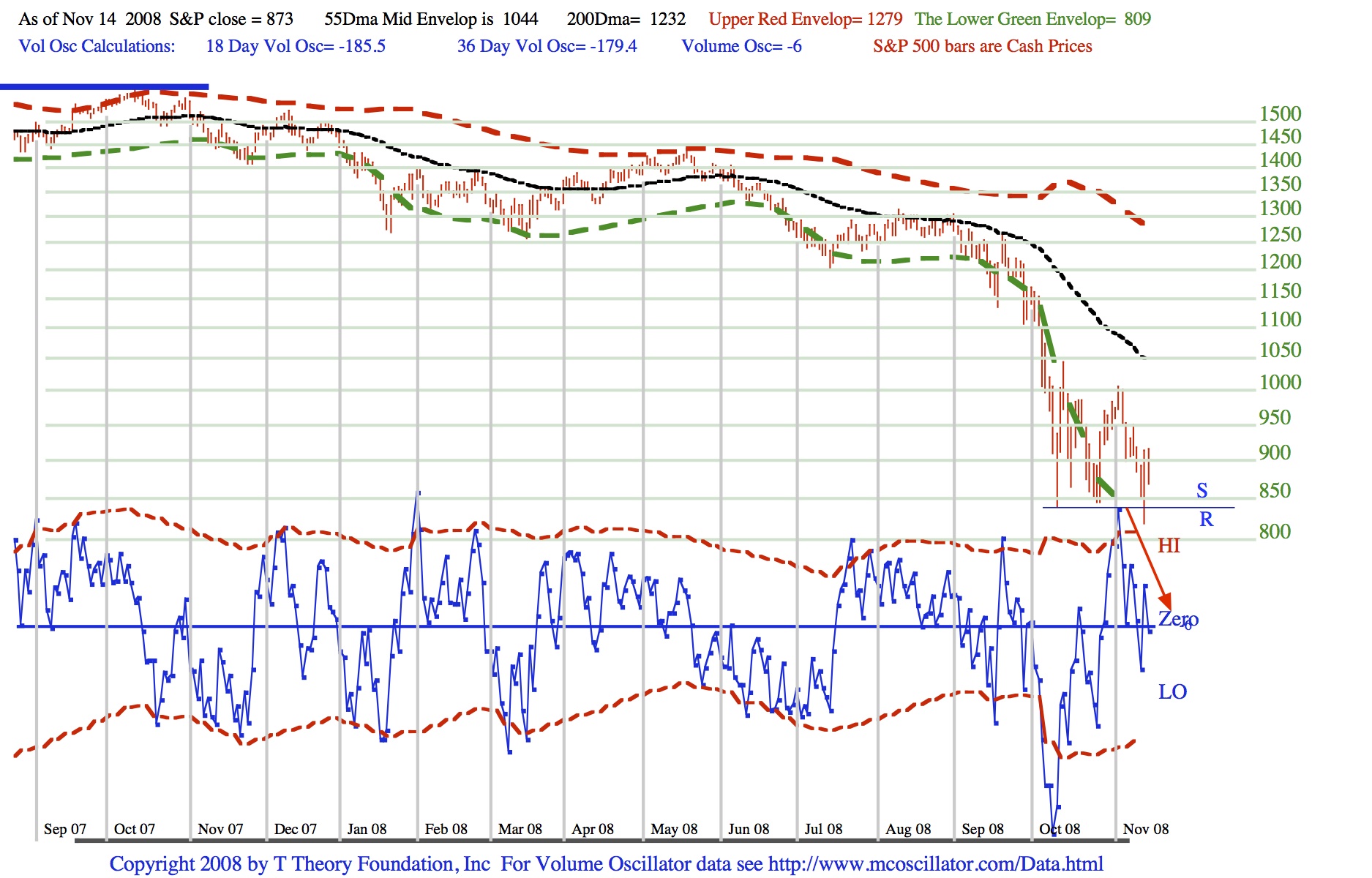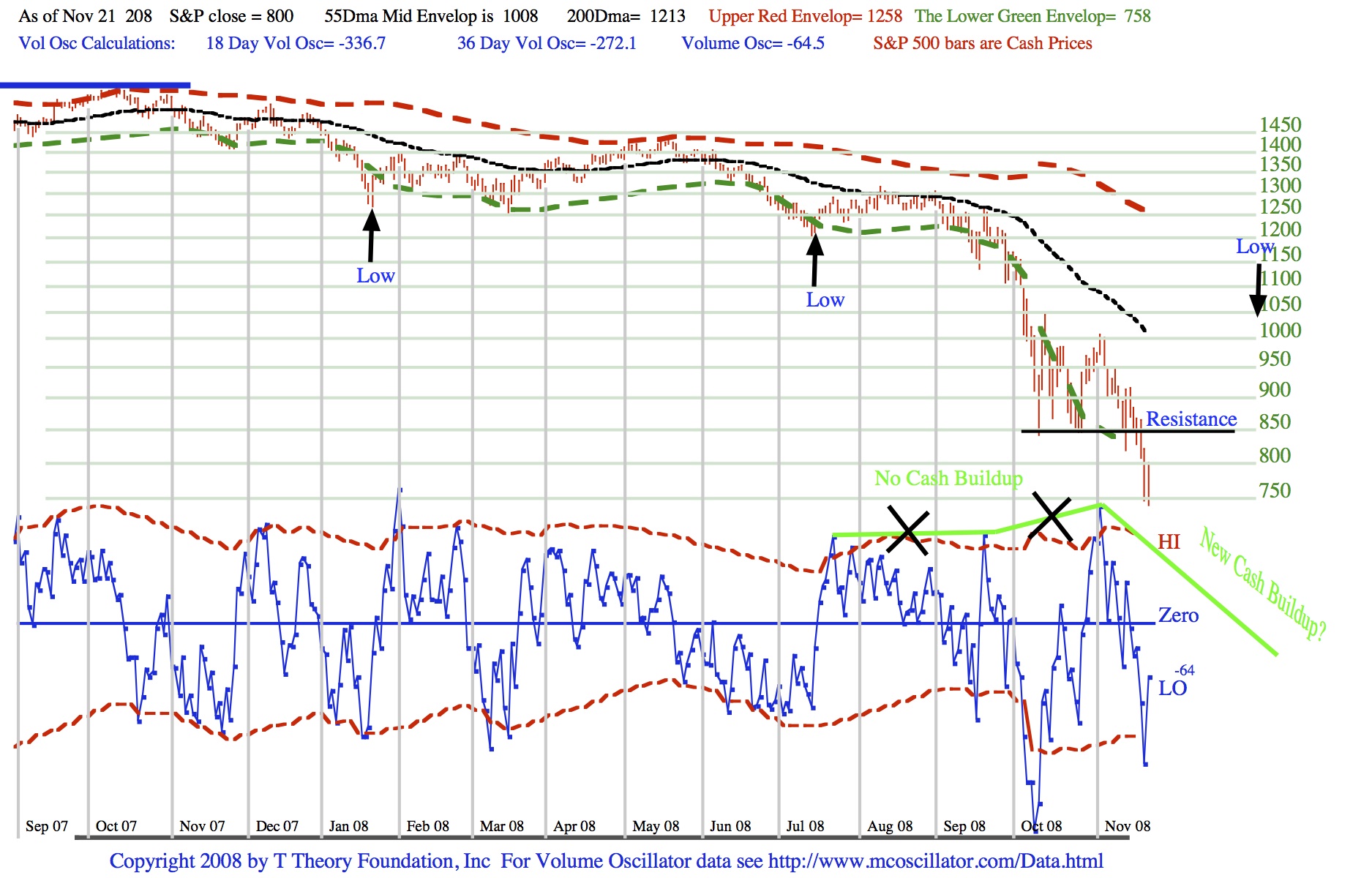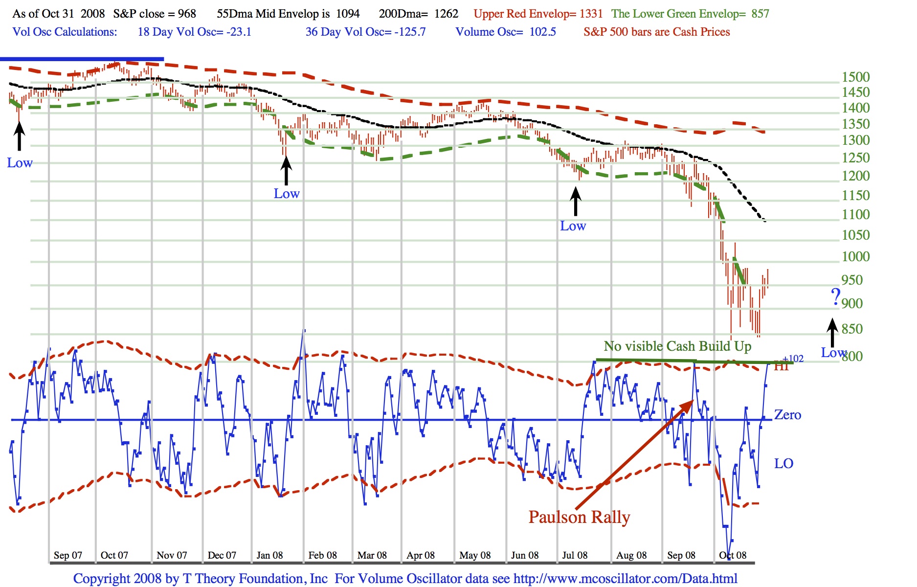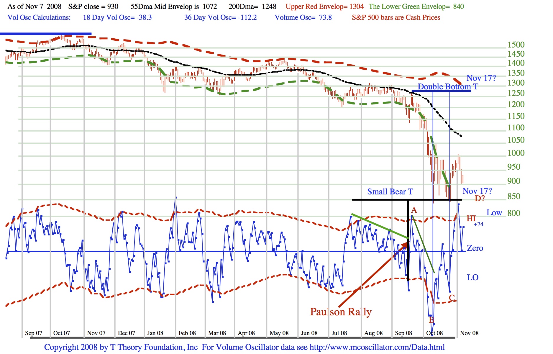 In Friday’s oscillator plot I have shown two small T interpretations with a third to be constructed probably in early December. These are complicated and not completely accurate as far as projected peak dates are concerned but I did the analysis and thought it might be interesting to make a few brief comments. The interpretation from August ’08 to Nov 17, the next projected peak can made by the two small classic T types sketched in the volume oscillator. The first is a classic bear type T formed by the Paulson Rally. The green cash build up is conventional and the Ts time symmetry calls for an early November peak. Its collapse in the right side is normal in bear markets and Nov 5 was probably its peak date.