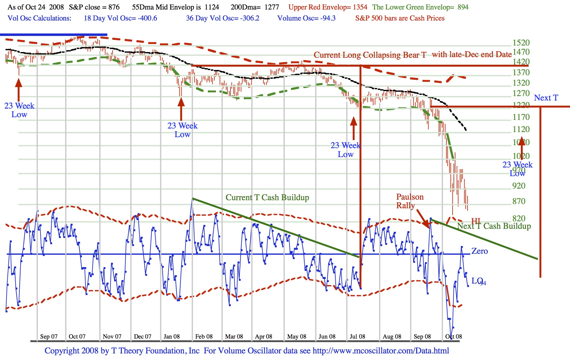 Last week I discussed the 23 week cycle and  the likelihood it would extend the current steep decline into early December. This week that same forecast can be seen from the current chart which diagrams the long time span of a collapsing Bear type of T. Bear Ts are common in down trends and permit an ongoing decline to continue into the right side of a T.