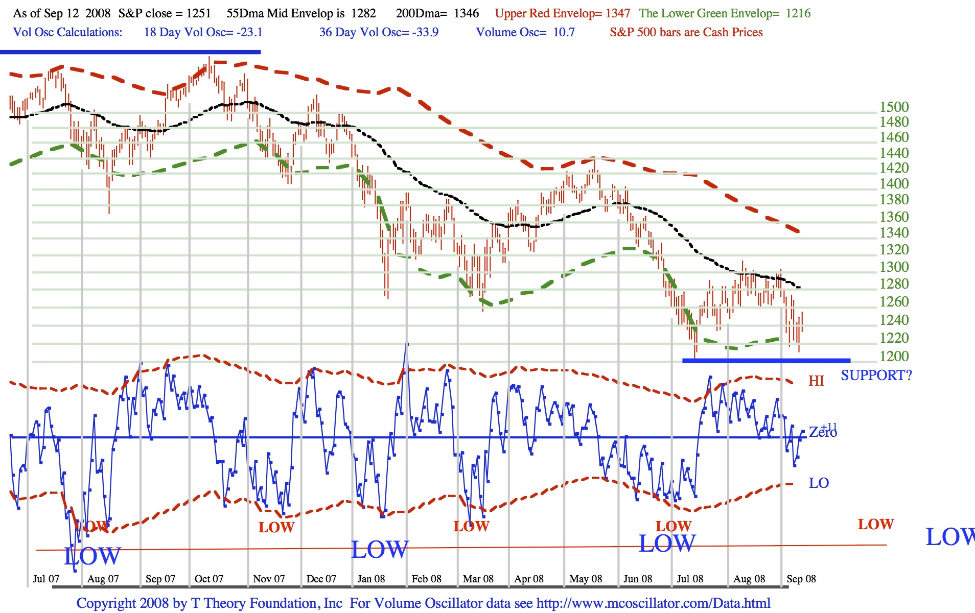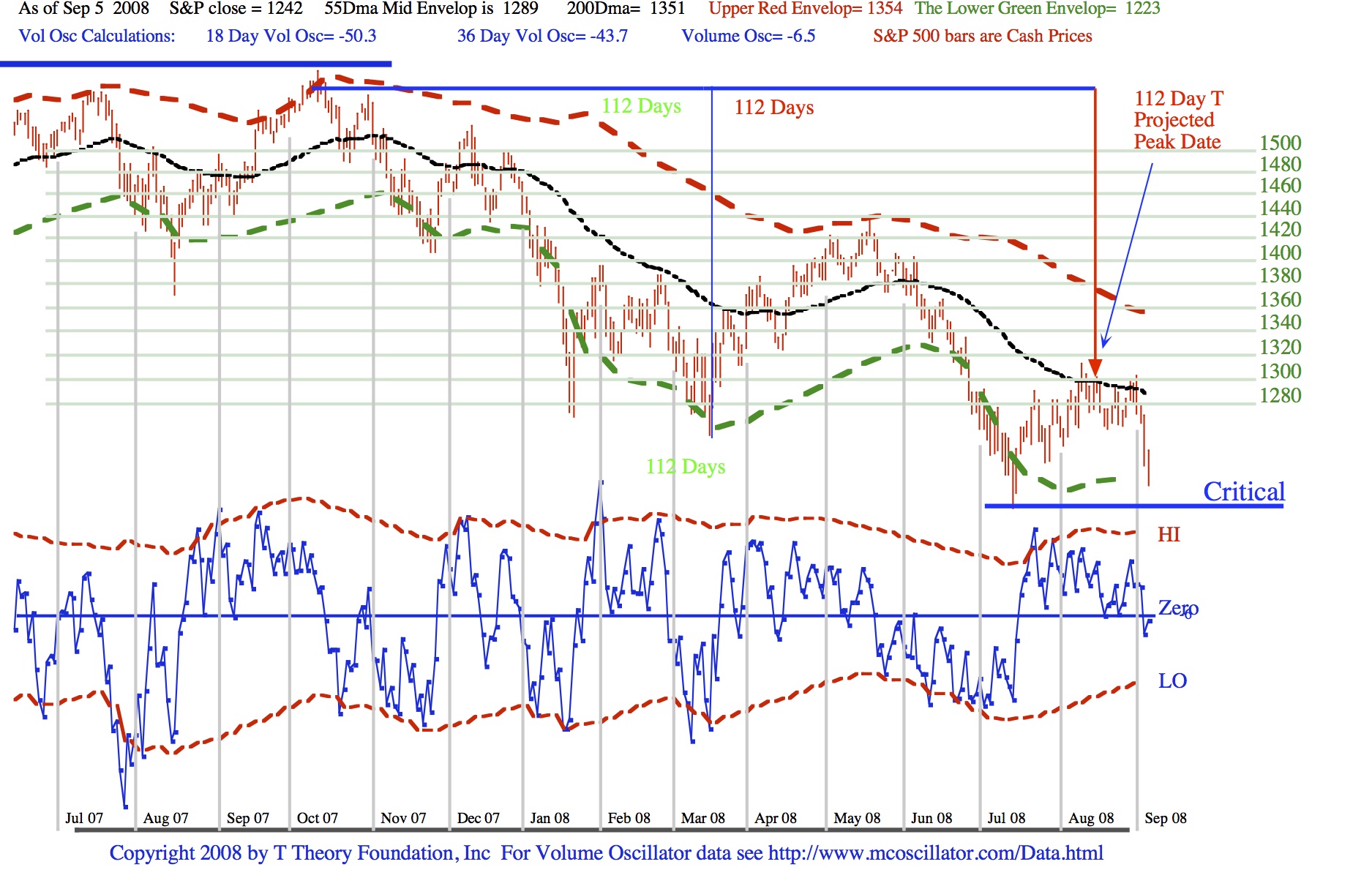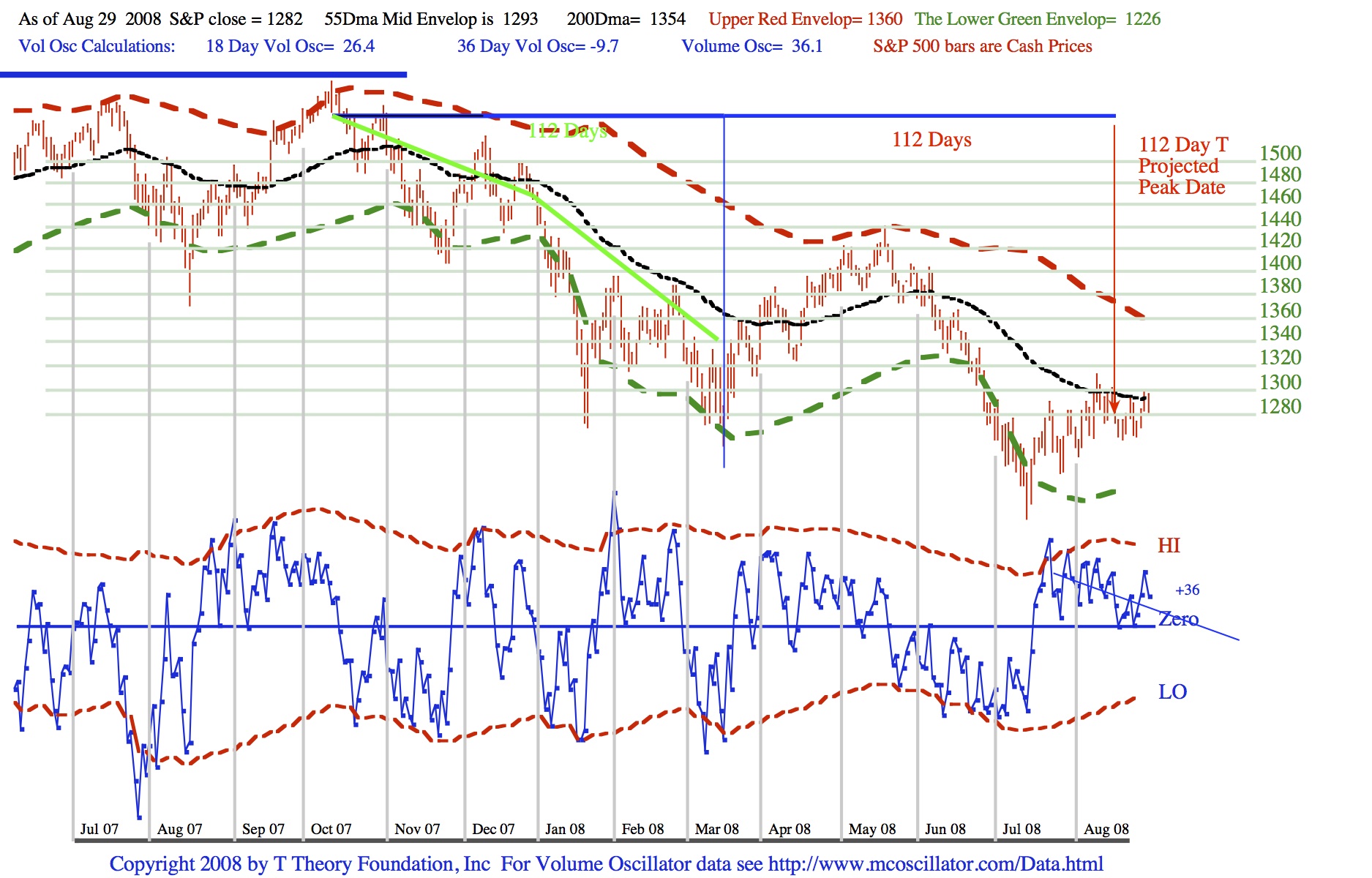 Hurst’s second important contribution to my work was the insight that cycles are most easily seen by enclosing their price fluctuation through time within constant vertical price width envelopes much as I have done in my chart. I would never have thought that trends were contained within envelopes until he proposed it as a fundamental property of the “amplitude-duration relationship”. This led to my most recent discovery that, while the daily price progressions within the red/green envelopes is statistically distributed to a normal degree, the key turning points for trends is “quantized” to one of the three specific price levels in the chart. Turning points can only occur at the three levels defined by my proprietary envelopes; the upper red dashed line as per mid May 08 , the lower green dashed line as per July 08 or at the mid channel line as per this August. In certain extreme cases such as 9/11 the trends will over run the envelope characteristics but within a few weeks the adaptation that I have built into the equations will restabilize the conclusions. In particular if the Support? level is broken and a sharp decline results near term, these channels will begin to adapt to the continuation of the bear market and the envelope rules for rallies will be maintained by the modified channel envelopes.