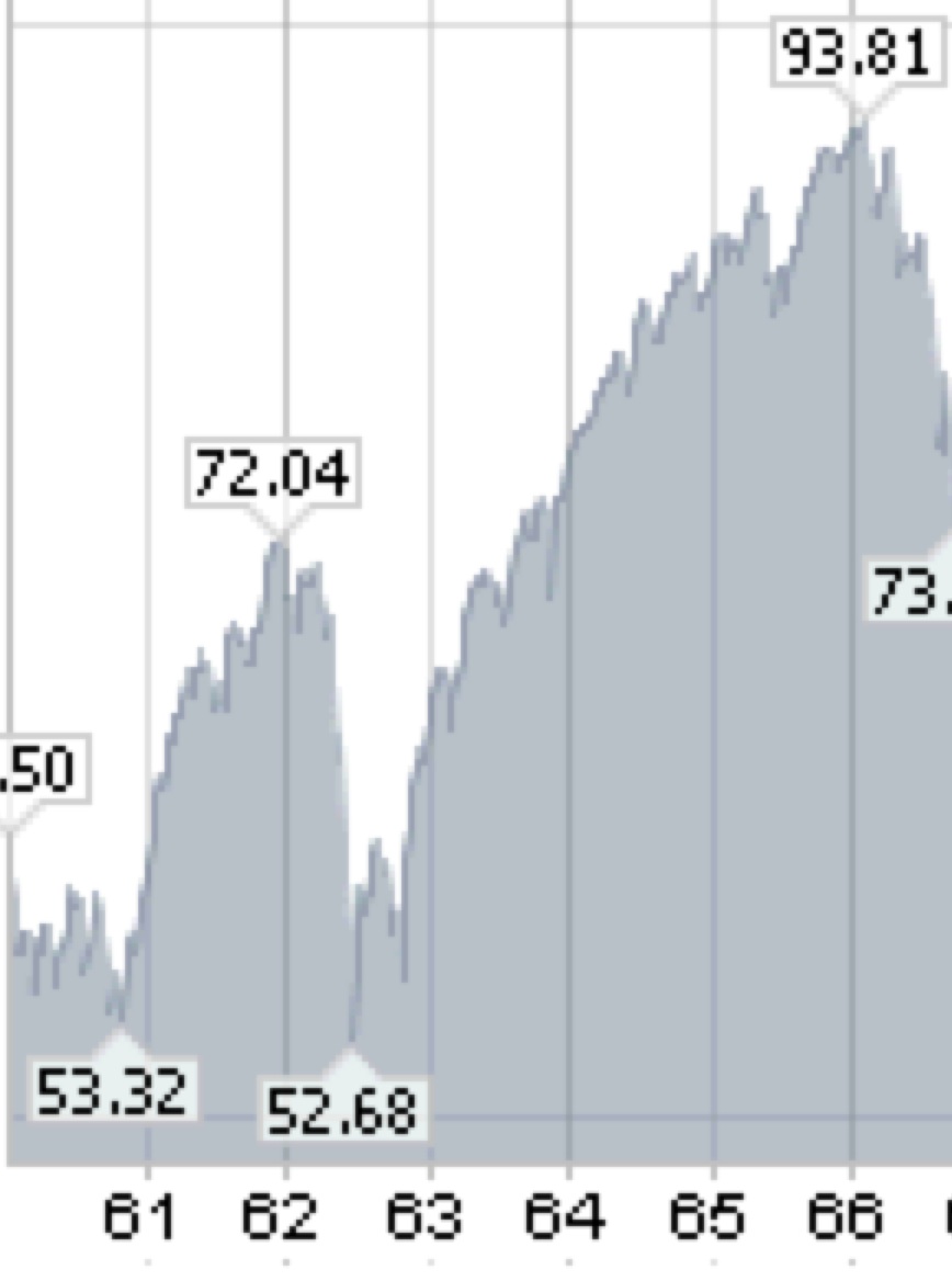 After the 1962 October Cuban missile crisis the market climbed seemingly constantly.  This skein lasted until the peak in early 1966 (beginning a 3 part bear market).  The trend was interrupted a few months prior to the actual peak (see chart below).  This dynamic uptrend lasted a little over 3 years and was punctuated by quick corrections that were meaningless.  In late 1963 (November), there is a market drop that denotes Kennedy’s assassination.  He was dead 13 months after the Cuban missile crisis, funny timing isn’t it.