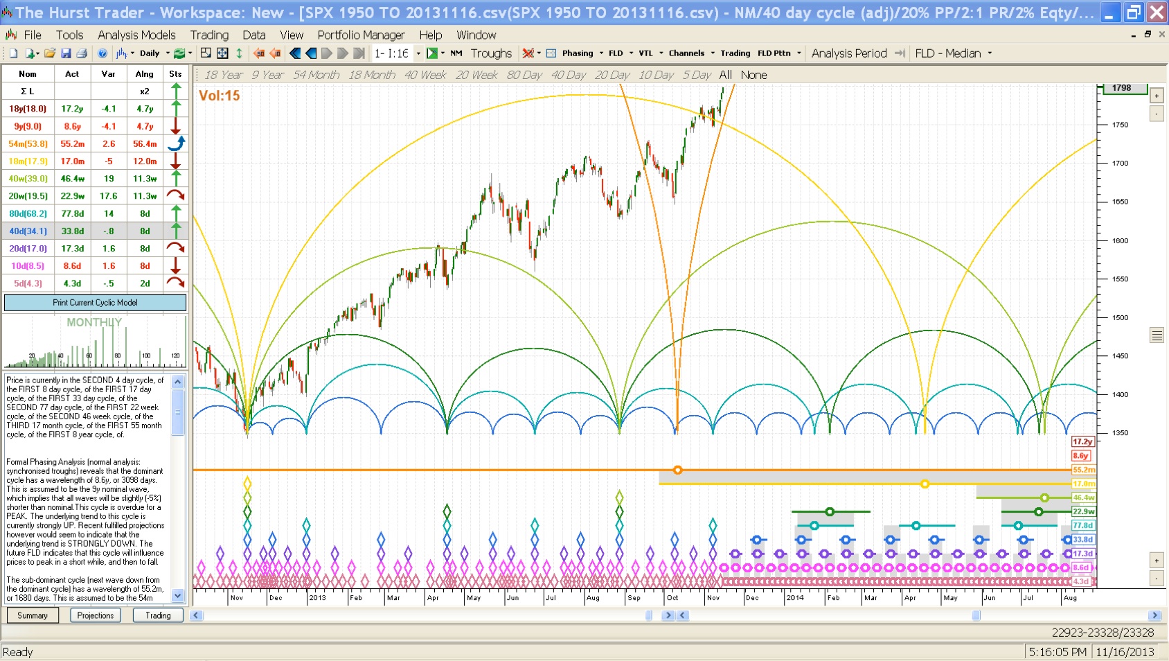 But . . . if the 54 month cycle were to sneak by without much fanfare (did it happen in Oct 2013???), that would mean a larger cycle than 54 months is dominating the trend. The next larger is the 8.6 year cycle. If this cycle (8.6 years) has not peaked, this would be exceptionally bullish. There is no disputing the fact that the 54 month cycle has been on the cyclic downside for 27 months and it accelerates down as it draws nearer the projected bottom date. But its cyclic downside has had no effect on the market’s ability to produce new all-time highs. Interesting!!! The last time we had a nullified 54 month cycle was during the 1990s.
