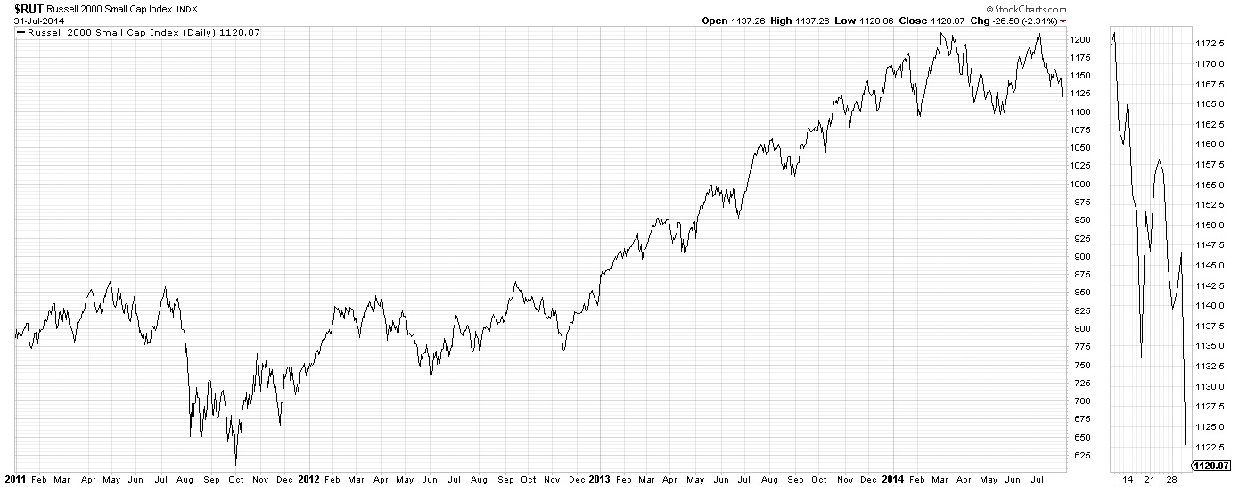 Russell falls below the 200 DMA on the last day of July in 20143) Stalled at the high the first week of July 2011, closed on the month low