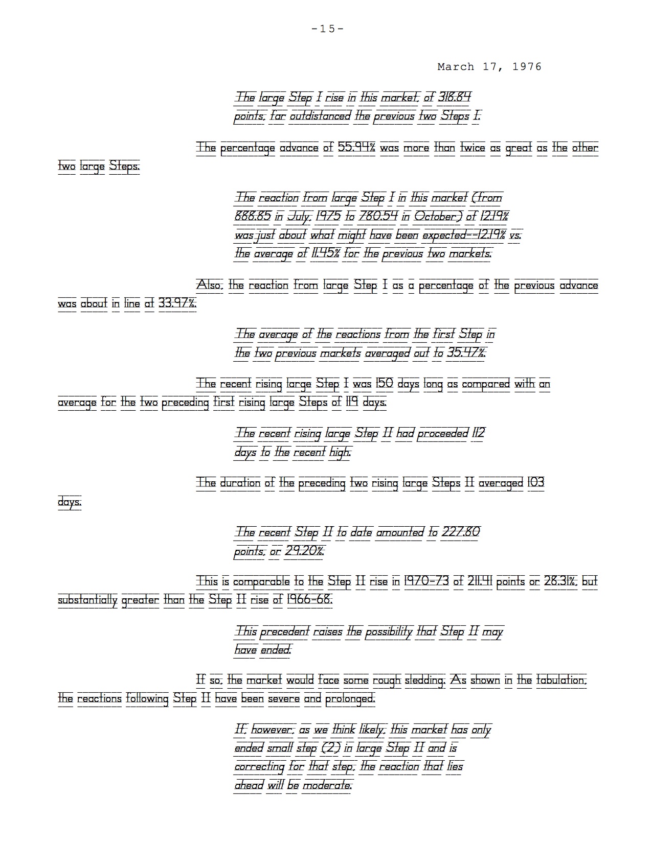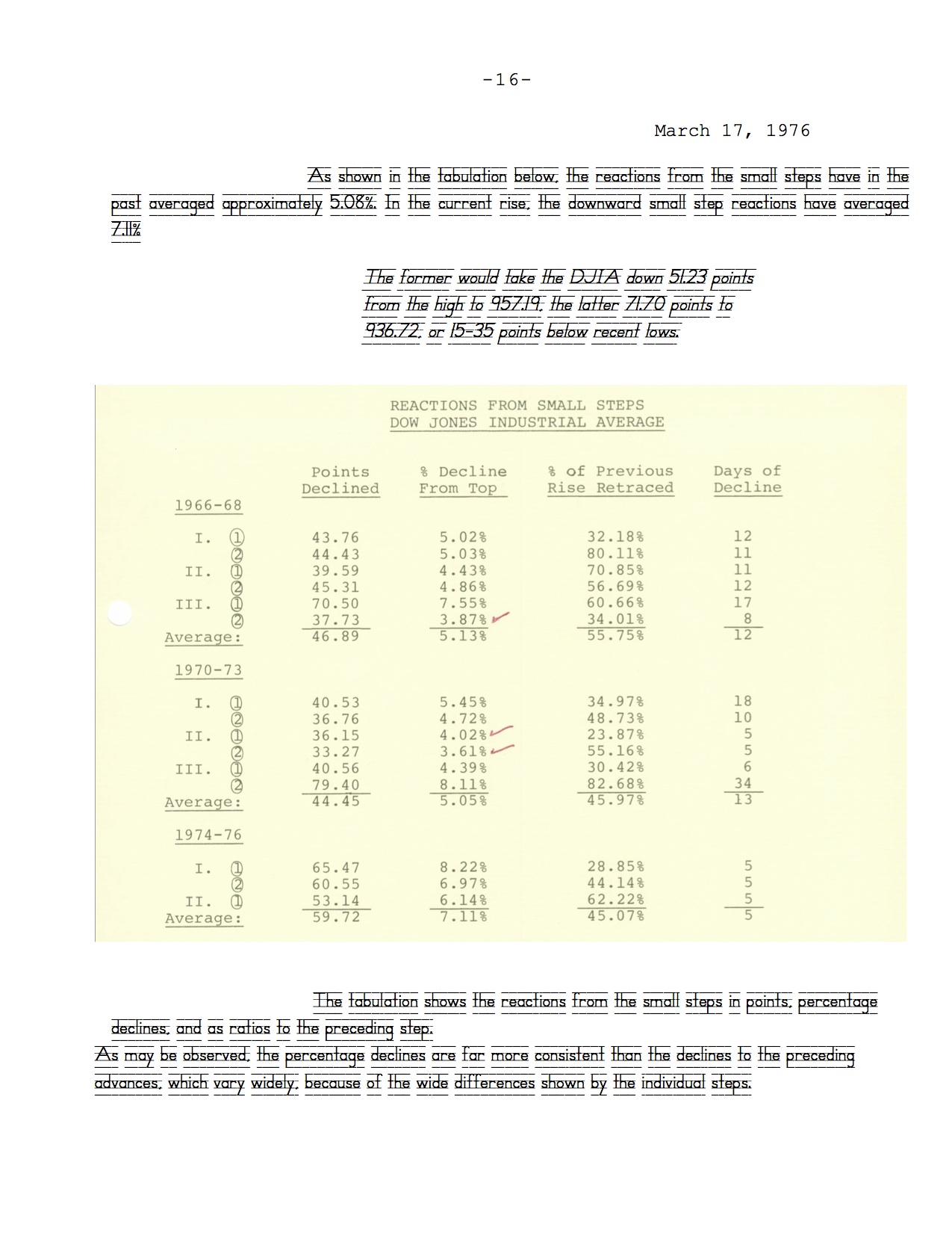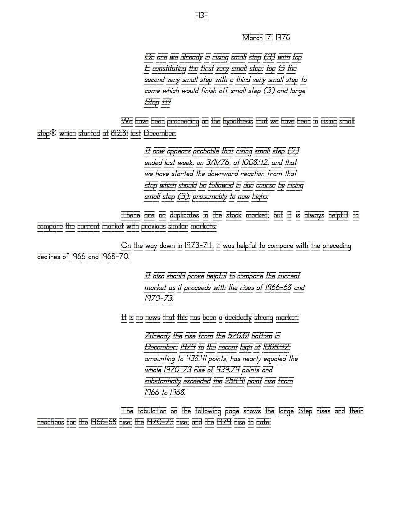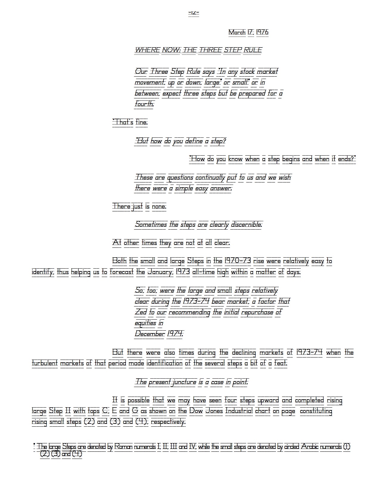 This article is “Where Now – The 3 Step Rule By Edson Gould (1976) ” written by Edson Gould in 1976. I have selected a font that is possibly not OCR readable. This font should yielded jibberish errors with OCR software. The article as displayed on this page is too small to be readable. Enlarge the page by clicking on it and it should then fill your screen, if not click on it again. If you have a problem reading it on your computer, print the article and you’ll find it easier to read.