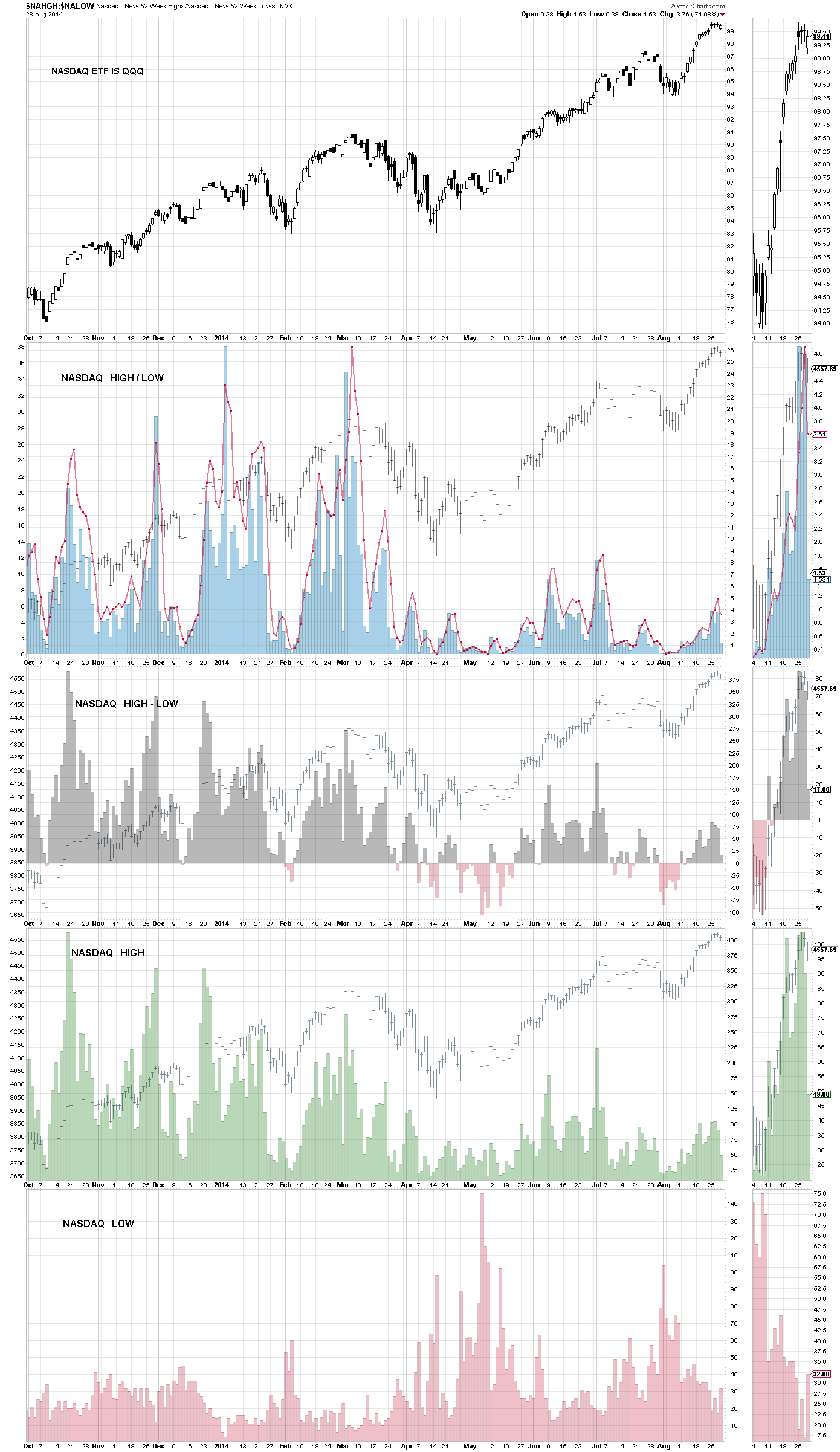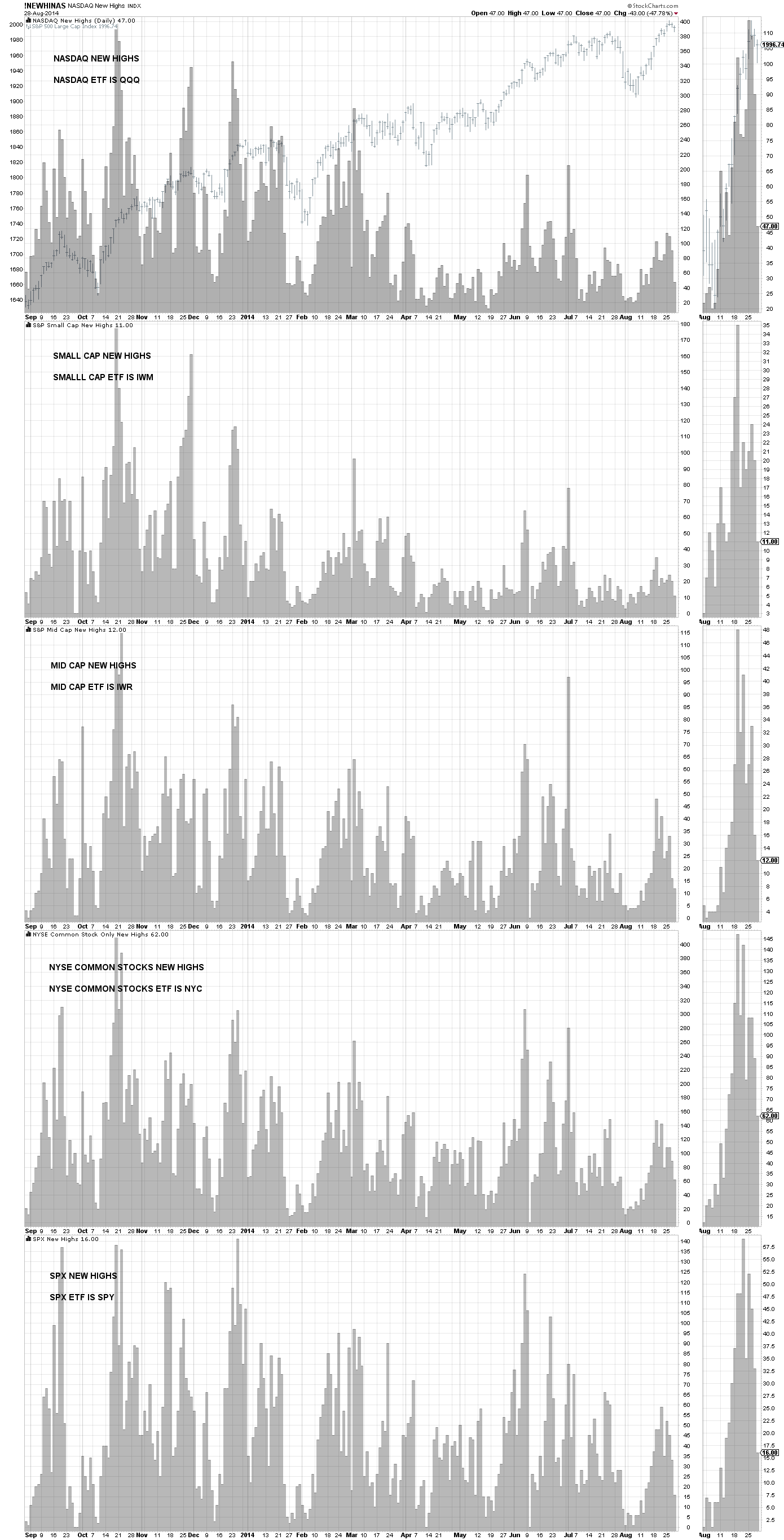 This is the daily new highs for various indexes and is illustrated by a gray histogram, SP 500 is in the background. No lows are used in the calculation of these charts.